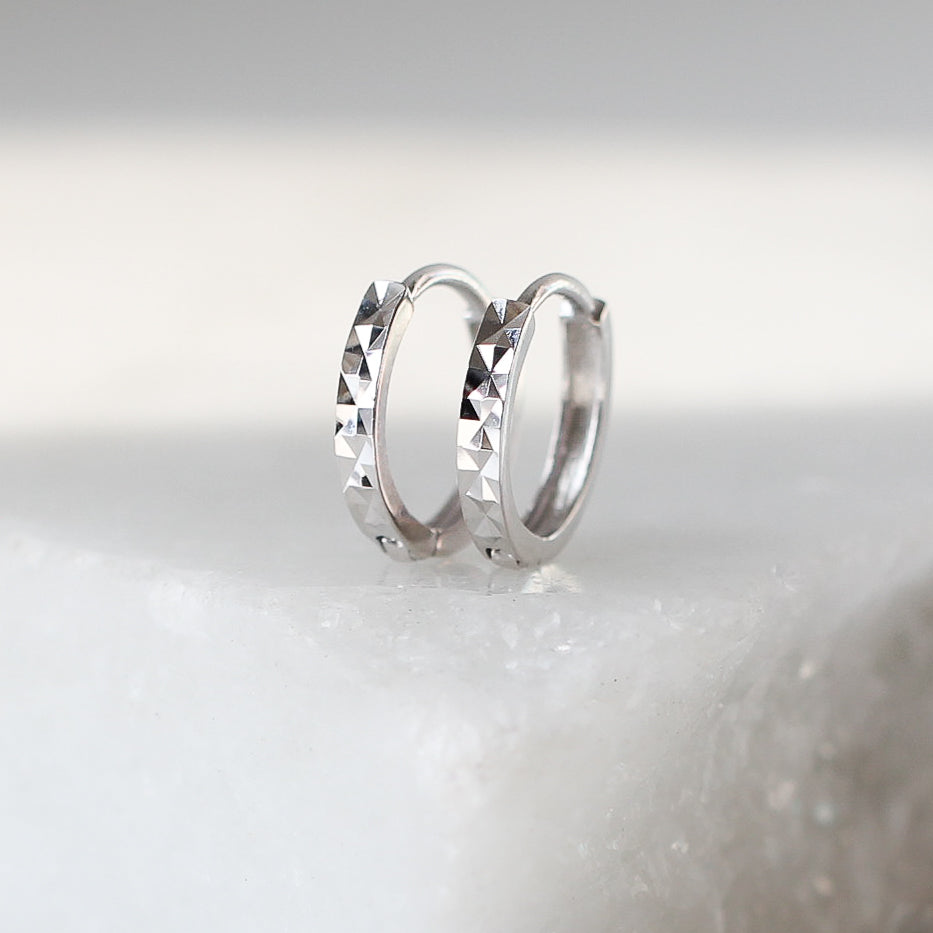 Fun and sparkly modern hoops for every day. These earrings have a lot of presence without being too big. Featuring diamond cut surface on top and smooth on the sides. Hinged to open and clicks into place for secure daily wear. Treat yourself or a loved one.