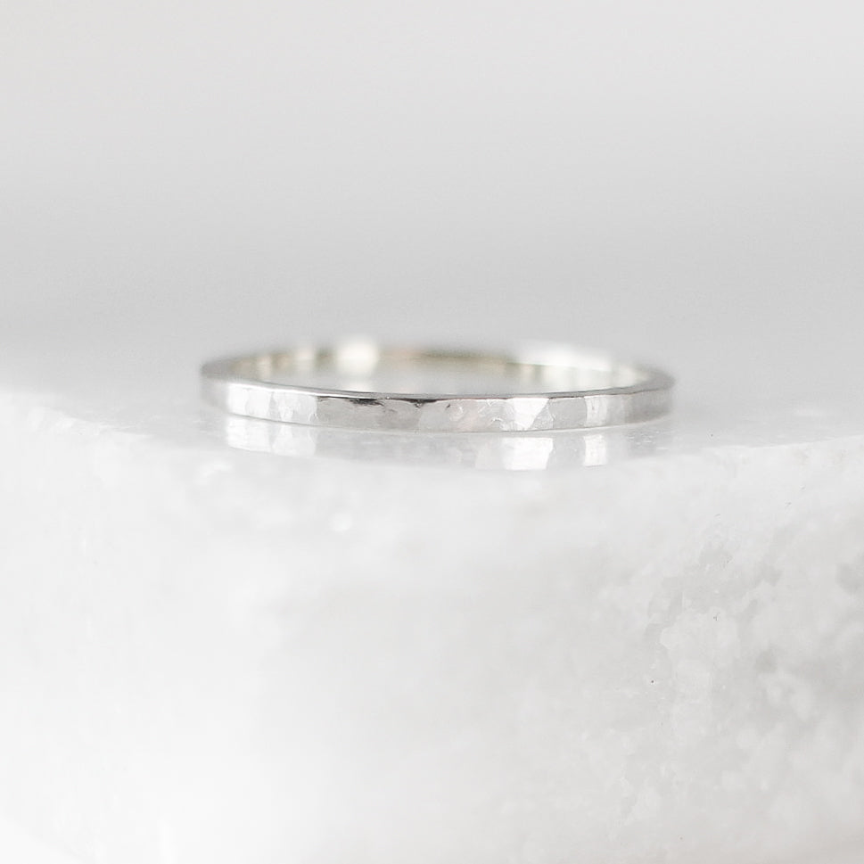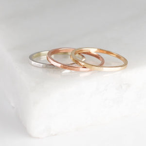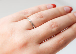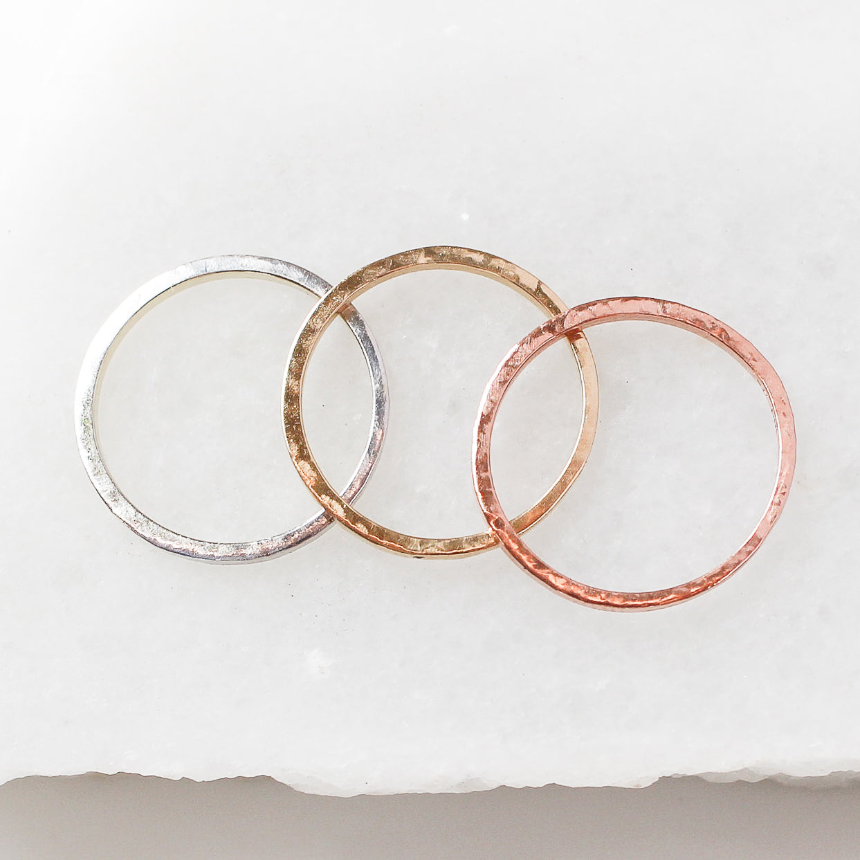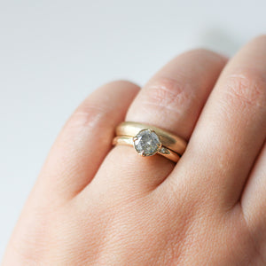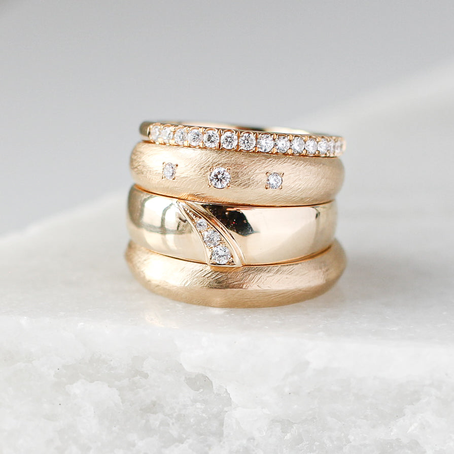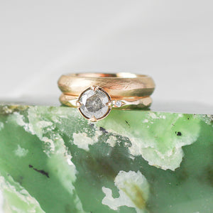 Sunrise Diamond Crown Band stacked with salt and pepper diamond ring on marble