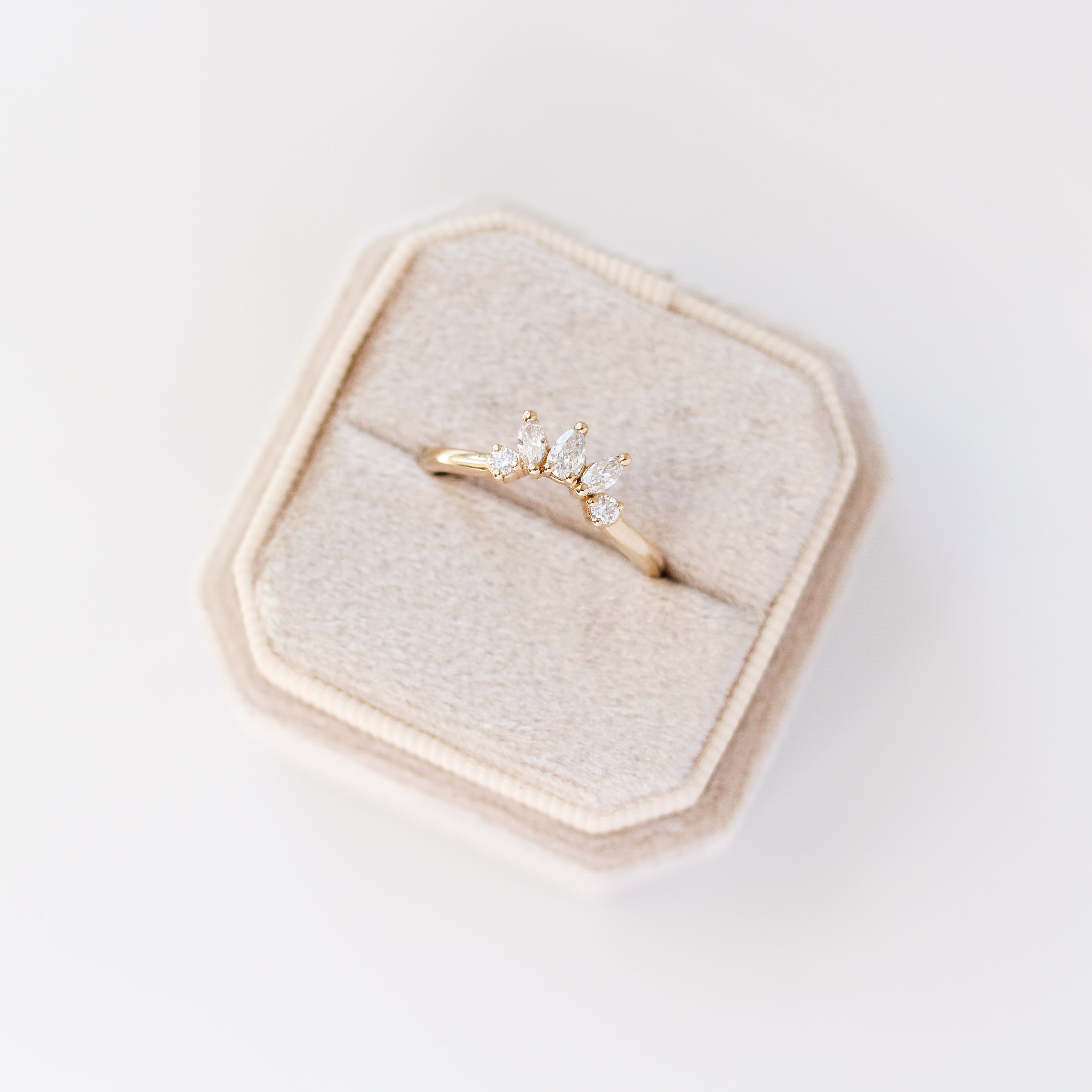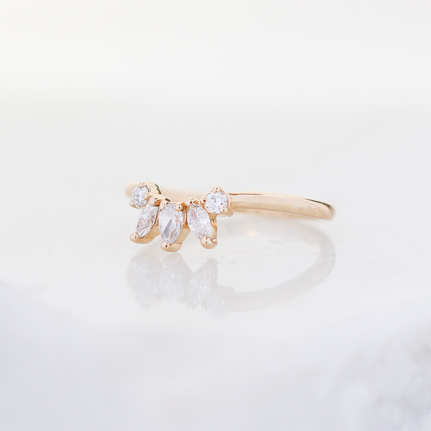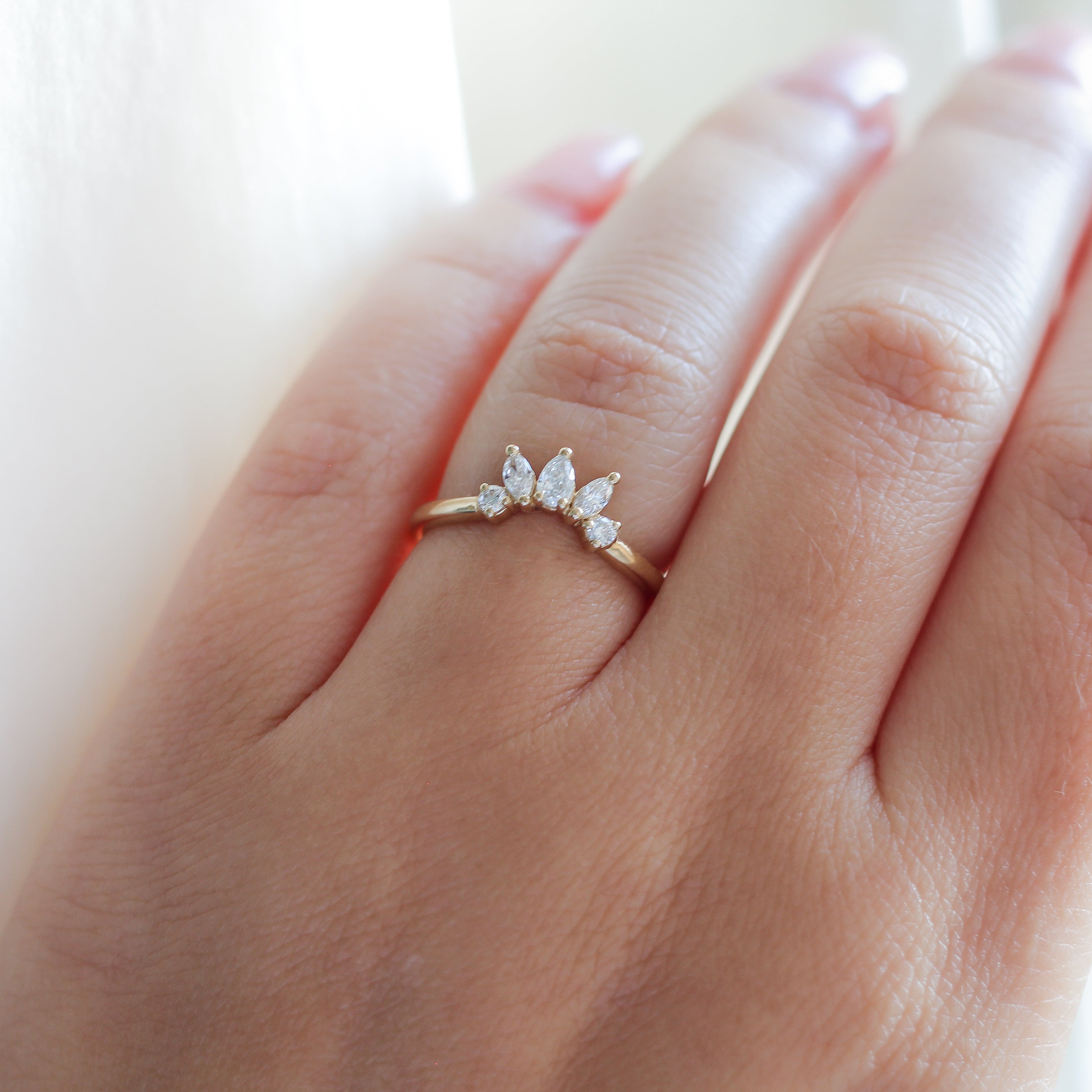 Lab created diamond crown band that is delicate yet striking. The contour resembles the sun just peaking over the horizon of an early morning. Stacks great with medium sized round, oval or pear shaped rings.