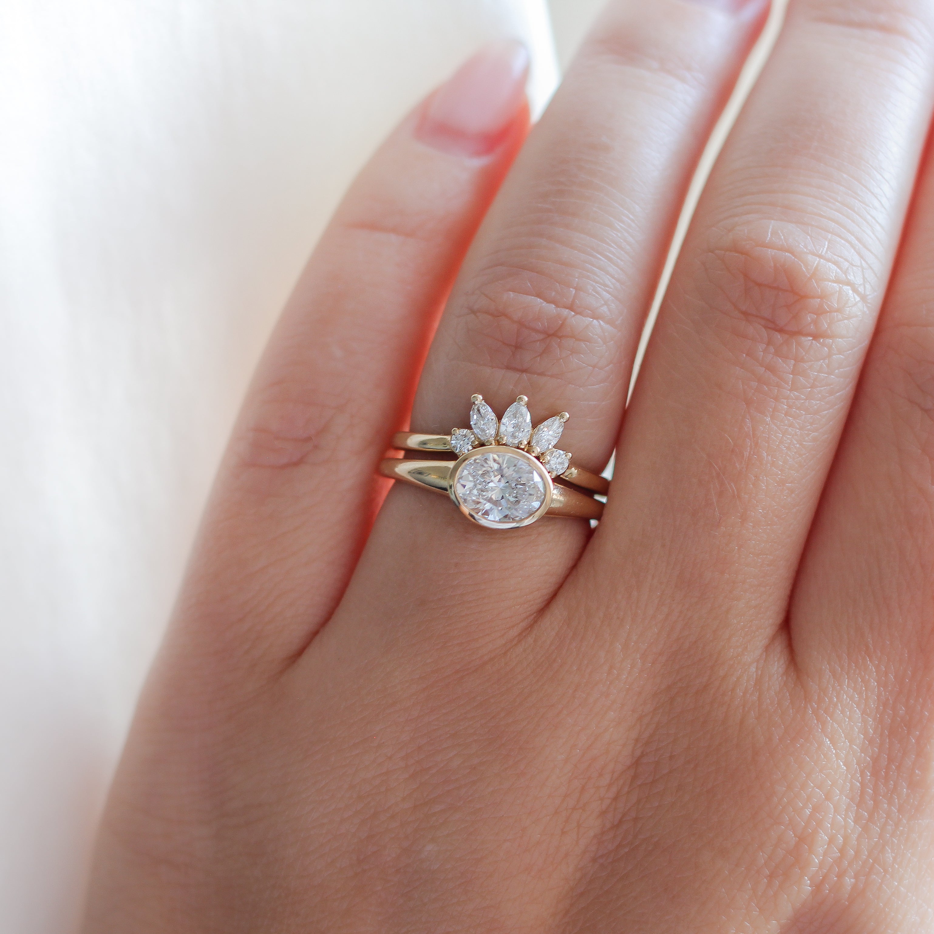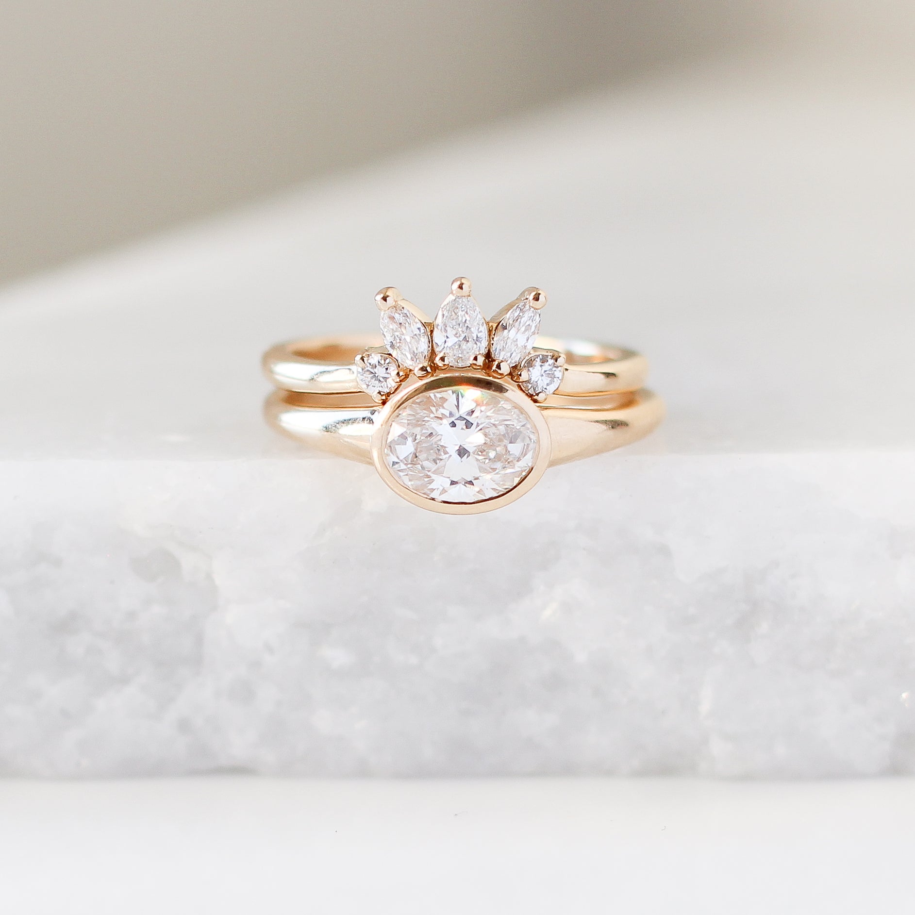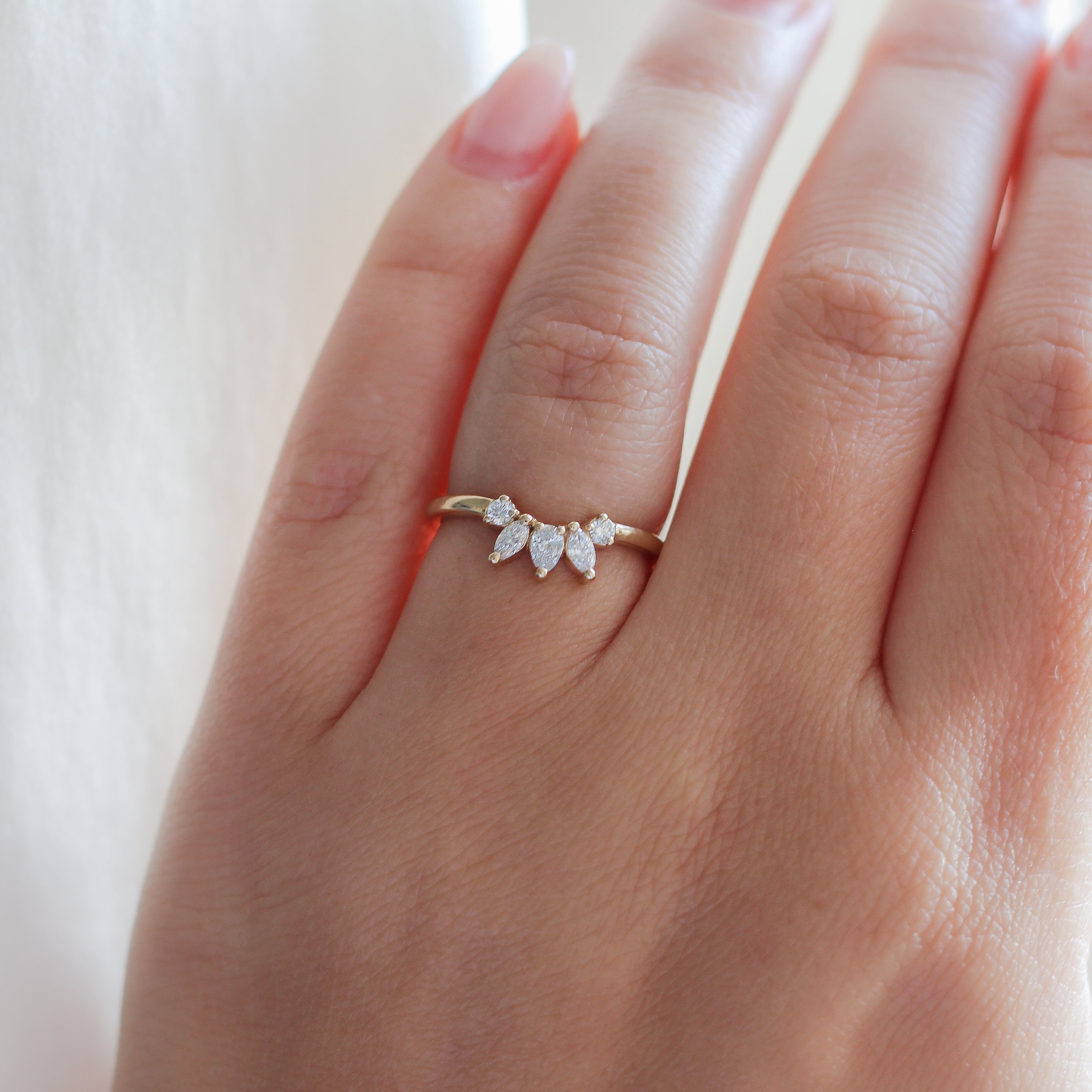 Lab created diamond crown band that is delicate yet striking. The contour resembles the sun just peaking over the horizon of an early morning. Stacks great with medium sized round, oval or pear shaped rings.